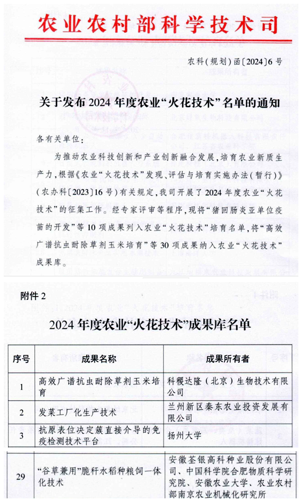 據悉,農業“火花技術”征集評選工作由農業農村部于2022年首次開展,征集處于萌芽狀態或成長階段、尚未大面積推廣,但未來有可能對農業生產和產業發展產生積極影響的新技術、新產品、新工藝、新設計、新材料、新方法、新資源、新裝備、新模式等農業科技成果,旨在推動農業科技創新成果早日轉化為農業新質生產力。