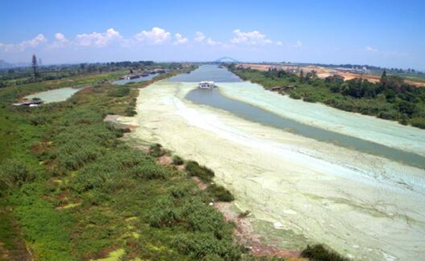 藍藻磁捕船開過稠藍的藻水,形成強烈的對比
