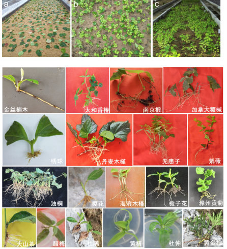 隨著國民經濟的發展和居民生活質量的提高,人們對生態環境提出了更高的要求,從而加速了林木、花卉及木本經濟作物等種植產業的發展。目前在生產上,大部分林木、花卉及木本經濟作物主要采用播種、扦插和嫁接等傳統育種方式進行繁育,繁育過程存在后代分離和性狀不穩定、繁殖效率低、受季節限制等問題。少數種類上述植物還可以采用現代生物技術——植物組織培養進行繁育,但存在繁育成本高、操作過程繁瑣等問題。針對上述植物繁育所存在的諸多問題,項目組采用傳統扦插與現代育種技術相結合的方法,成功研發了景觀園藝植物規?;咝г偕夹g。該技術以植物的一葉一芽為材料,通過化學藥劑處理,讓其迅速生根成苗。該技術是對傳統與現代育苗技術的集成與發展,它既有傳統育苗的易操作性,又有現代育苗的高效性,也就是說它克服了傳統育苗的季節限制與現代育苗的操作繁瑣及高成本弊端。目前利用該技術對多種植物(如加拿大糖槭、蠟梅、南京椴、油桐、無患子、烏桕、紫薇、海濱木槿、繡球、丹麥木槿等)進行小規模繁育。相關關鍵技術已申報國家發明專利30余項。