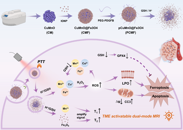 銅基納米材料具有極強(qiáng)的催化類芬頓反應(yīng)的能力,可以提高細(xì)胞內(nèi)的活性氧水平,從而抑制腫瘤的生長,但其穩(wěn)定性較差。為了解決這個(gè)問題,團(tuán)隊(duì)開發(fā)了一種對腫瘤微環(huán)境響應(yīng)的核殼結(jié)構(gòu)銅基納米復(fù)合材料,并將靶向腫瘤細(xì)胞的靶標(biāo)連接到其表面,再借助材料中氧化鐵殼層的空間位阻效應(yīng)的保護(hù),從而促進(jìn)該復(fù)合材料穩(wěn)定順利地到達(dá)腫瘤部位。到達(dá)腫瘤部位后,該材料會被腫瘤微環(huán)境中的弱酸條件和谷胱甘肽瓦解并釋放金屬離子和超小氧化鐵。這個(gè)過程不僅激活了磁共振成像信號,還消耗了谷胱甘肽,加速了芬頓和類芬頓反應(yīng),提高了細(xì)胞內(nèi)的活性氧水平,加劇了細(xì)胞內(nèi)的氧化應(yīng)激,最終誘導(dǎo)腫瘤細(xì)胞凋亡和鐵死亡。通過這種方式,可以實(shí)現(xiàn)磁共振成像引導(dǎo)的腫瘤治療,為腫瘤的特異性多模式診療提供了新的借鑒。