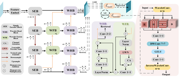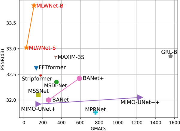 在該項(xiàng)工作中,科研團(tuán)隊(duì)提出了一種基于單輸入多輸出(SIMO)的多尺度運(yùn)動(dòng)去模糊網(wǎng)絡(luò),簡化了現(xiàn)有基于由粗到細(xì)方案算法的復(fù)雜性。同時(shí),為了減輕使用多尺度架構(gòu)帶來的細(xì)節(jié)信息修復(fù)缺陷,團(tuán)隊(duì)將真實(shí)世界的模糊軌跡特征與可學(xué)習(xí)的小波變換模塊相結(jié)合,重點(diǎn)關(guān)注從模糊圖像到清晰圖像之間逐步復(fù)原的方向連續(xù)性和頻率特性。團(tuán)隊(duì)創(chuàng)新了一種具有可學(xué)習(xí)離散小波變換的多尺度網(wǎng)絡(luò)(MLWNet),它在多個(gè)真實(shí)世界的模糊數(shù)據(jù)集上,無論在主觀和客觀質(zhì)量方面,還是計(jì)算效率方面,都表現(xiàn)出了最先進(jìn)的性能。