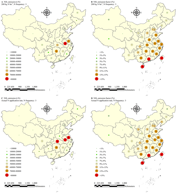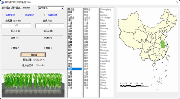 在190-210 kg N ha-1的施氮量下,水稻豐產與氨揮發減排的綜合效益最佳。在實際施氮量下,我國每個水稻季的氨揮發損失量約為85.2萬噸(折純氮),氨排放因子約為12.7%。湖北、安徽、江蘇等省份的稻田氨揮發總量較高,廣東、海南、臺灣等省份的稻田氨排放因子較高。在此背景下,團隊融合基礎數據集和氨揮發核心算法,進一步開發“稻田氨揮發評估系統V1.0”,可以在田塊、全省及全國三種地理尺度下評估稻田氨揮發量和氨排放因子,為優化施肥策略、減少氨排放、及開展農業與環境科學研究提供依據。