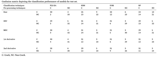 研究結果表明,偏最小二乘判別結合原始光譜數據模型最佳(Sn = 0.8824,Sp = 0.9429,Acc = 0.913)。最佳支持向量機模型的性能較差但優于隨機森林和k近鄰。除了偏最小二乘判別,四種不同的預處理方法均改進了所開發模型的性能。通過波長重要性分析顯示檢測稻種內部裂紋的重要變量與直鏈淀粉含量有關。總體而言,所有結果都證明了近紅外光譜結合偏最小二乘判別法無損檢測水稻種子內部裂紋的可行性。