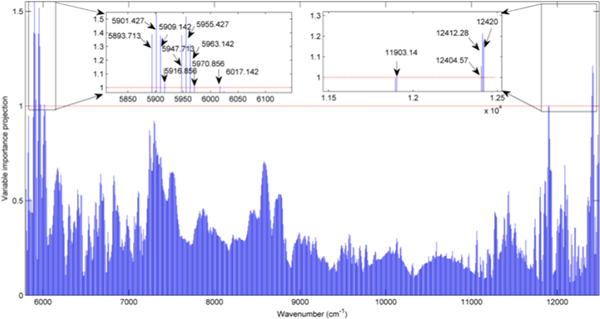 圖1 偏最小二乘判別獲得的變量重要性投影(VIP > 1)