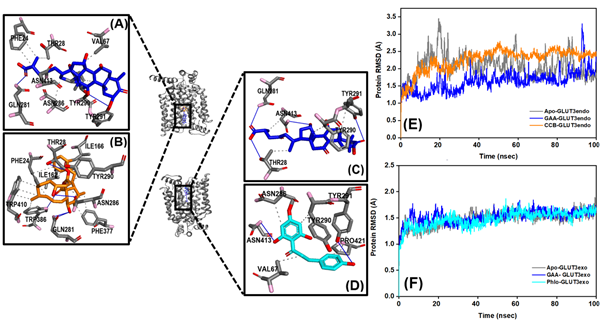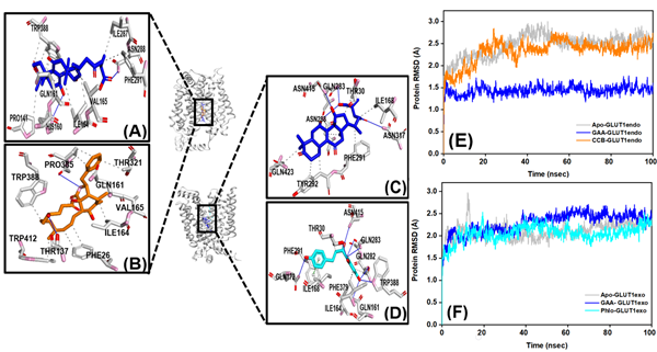 圖1 GAA 和標準抑制劑(細胞松弛素 B 和根皮素)與 GLUT1 的面內和面外構象復合物的分子對接和 MD 模擬分析