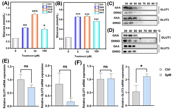 圖3 GAA 對 A549(分別為 A、C 和 E)和 H1299(分別為 B、D 和 F)中的葡萄糖消耗、細胞熱位移測定和基因表達的影響