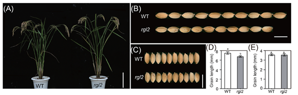 高產是水稻育種的主要目標之一,粒型(粒長、粒寬等)是影響產量的重要農藝性狀。科研團隊通過物理誘變獲得一個粒長變短而粒寬不變的突變體rgl2。細胞學分析發現,粒長變短主要由于細胞數量的減少,而非細胞長度的變化。圖位克隆和功能分析表明,RGL2編碼一種角蛋白相關蛋白(KAP),在幼穗中的表達水平較高。過表達可顯著增加粒長,并通過增加籽粒中的細胞增殖提高單株產量。此外,OsRGL2與RGB1蛋白相互作用,提示其可能通過調控G蛋白信號通路來正向調節粒型與產量。研究還發現,RGL2可能通過調控細胞周期影響粒長。因此,RGL2通過調節細胞周期相關基因影響細胞增殖,從而正向調控水稻粒長。這一發現不僅加深了對水稻粒型遺傳機制的理解,也為水稻高產的分子設計育種提供了新的策略與方向。