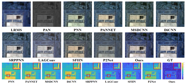為克服上述挑戰,研究團隊提出了全新的頻域無關特征學習框架。該方法通過分析圖像幅值與相位分量中的域無關信息分布,利用頻率信息分離模塊和可學習的高頻濾波器來對圖像信息進行解耦,再將這些信息輸入專門設計的子網絡進行學習。最終,經過信息融合與恢復模塊的動態特征通道權重調整,生成高質量的融合圖像。在多個公開數據集上的跨場景測試結果表明,該方法在泛化性能方面表現優越,能夠有效應對不同數據分布的挑戰。通過在WorldView-III數據集上訓練,并將其泛化到其他數據集進行測試,該方法不僅在訓練數據集上保持了卓越的表現,且在泛化數據集上相比次優方法,分別在WorldView-II和GaoFen-2數據集上取得了1.46 dB和4.97 dB的峰值信噪比(PSNR)提升。此外,視覺效果的對比驗證了該框架在域無關信息提取和學習上的有效性,能夠在數據分布存在顯著差異的情況下,保持穩定的性能。這進一步證明了該方法在解決遙感圖像全色銳化泛化問題中的重要價值。