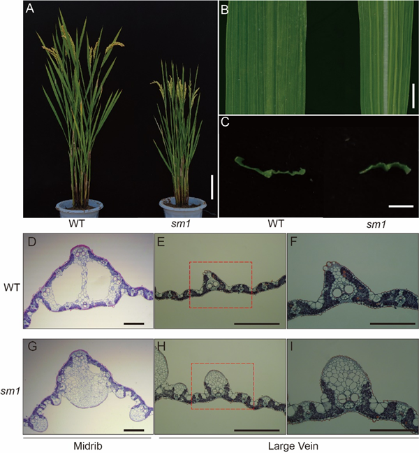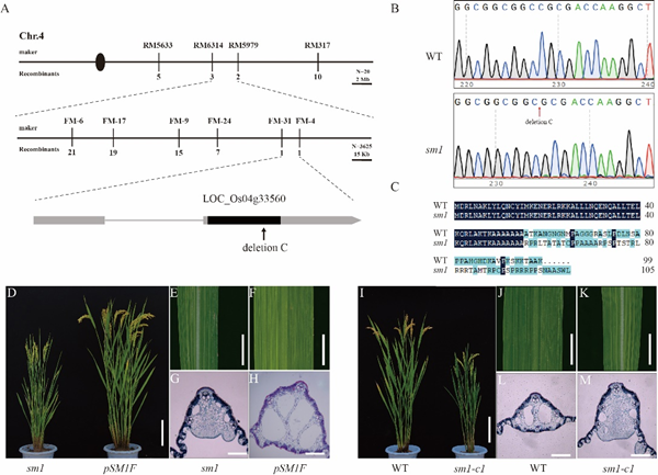 水稻葉脈作為水稻葉片重要的結構,一方面為水稻葉片提供力學支撐,另一方面介導著水、氣體、碳水化合物等物質的運輸,對水稻的生長發育起著非常關鍵的作用。然而,目前對水稻葉脈的形成與發育的分子機制研究尚不清楚。科研團隊利用重離子輻照誘變獲得一個葉片中脈空腔被薄壁細胞填充的水稻實心葉脈突變體,同時表現植株變矮,植株干重降低49.0%(圖1),利用圖位克隆技術獲得控制水稻通氣組織發育的關鍵基因SM1 (Solid Midrib 1, SM1) (圖2)。分子機制研究顯示:SM1基因編碼一種小型拉鏈蛋白(ZPR),它可以與OSHB1相互作用,抑制OSH1(莖尖分生組織形成的關鍵調節因子)的表達,從而影響水稻葉片通氣組織的發育。