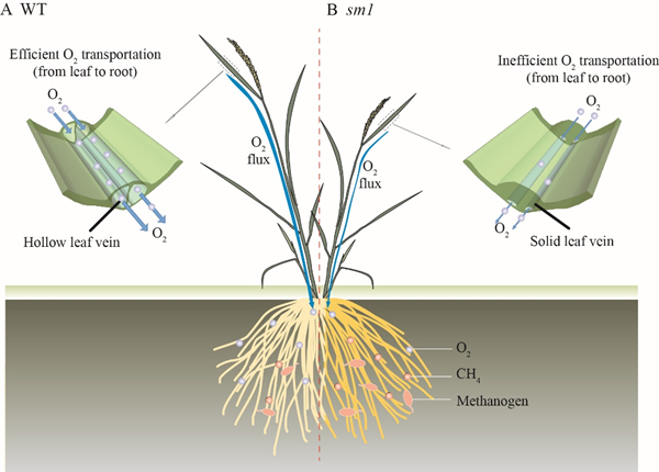 科研人員通過進一步研究發現,sm1突變體中通氣組織被薄壁細胞填充,導致向根部運輸氧氣能力減少16.8%,水稻根際產甲烷菌活性增強,甲烷排放總量增加約96.8%(圖3)。進而揭示了水稻通氣組織對水稻生長和稻田甲烷排放具有關鍵作用,通過對sm1突變體研究也為育種提供新的思路,即選育水稻通氣組織發達的水稻品種,向水稻根際提供更多的氧氣,既有利于水稻“根深葉茂”獲得高產,又可以降低稻田甲烷排放,實現水稻生產可持續發展。