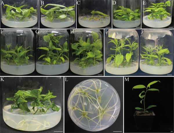 科研團隊通過以帶腋芽的杜仲莖段為初始外植體,通過直接再生途徑,實現了杜仲的高效再生(圖1),其中芽誘導率為100%,芽增殖率高達500%,且4周就實現了芽的伸長和增殖,這標志著杜仲再生效率的顯著提高。此外,為解決杜仲再生過程中不定根誘導困難且基部伴有愈傷組織形成導致后期再生苗移栽成活率低的挑戰,團隊研發了杜仲組培苗兩步生根技術,使得杜仲在11天即能生根,且不定根誘導率達到93.02%,顯著縮短了杜仲優良種苗的生根時間,提升了杜仲再生種苗的質量。本研究建立的微繁技術體系為優良杜仲種質資源的保存、種苗的工廠化生產和后期的品種改良提供了技術支撐,同時也為難生根樹種的細胞工程育苗提供了借鑒。