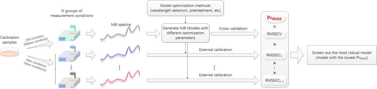 近紅外光譜技術(NIRS)作為一種前景廣闊的無損檢測方法,其預測性能高度依賴于定標模型的質量。然而,測量條件的變化常導致模型預測結果出現顯著偏差,因此成熟的近紅外模型需具備強穩(wěn)健性以抵抗環(huán)境干擾。針對這一問題,該研究團隊提出以穩(wěn)健預測而非準確預測為導向的近紅外模型優(yōu)化的觀點,并介紹了一種具體實現路徑,即ECA方法。研究團隊通過引入新測量條件下采集的外部樣本對初始模型進行校準,使其快速適應不同檢測環(huán)境。該方法創(chuàng)新性地結合交叉驗證與外部校準結果,提出穩(wěn)健性評價指標PrRMSE,通過多參數建模組合篩選出最優(yōu)穩(wěn)健模型。研究人員將ECA方法與競爭性自適應重加權抽樣算法(CARS)融合,形成ECCARS優(yōu)化框架,并以一組實驗室測量的米粉數據集和兩組玉米公開數據集為對象驗證其效能。結果表明,與傳統(tǒng)CARS方法相比,ECCARS選擇的模型在不同測量條件下的校正均方根誤差降低12.15%至725%,驗證均方根誤差降低27.63%至482%,穩(wěn)健性明顯提高。