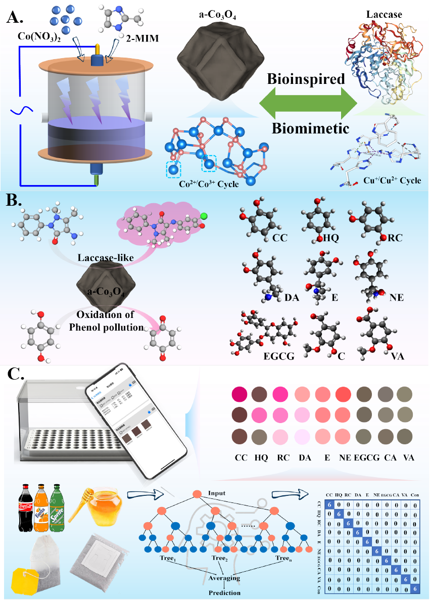 近年來,黃青課題組開展低溫等離子體(LTP)技術的應用基礎研究,在利用氣-液界面低溫等離子體制備納米酶材料方面也做了許多新的嘗試(Chemical Engineering Journal Advances,2021,8: 100185;?Journal of Hazardous Materials,2025,493: 138282;Biosensors and Bioelectronics,2025,267: 116784.)。在這項研究中,他們通過模擬天然漆酶中的氧化還原電子對和配位環境,利用氣液界面介質阻擋放電(DBD)等離子體技術制備了無定形四氧化三鈷(a-Co3O4),它具有Co2+/Co3+和Co-O活性位點,具有類似漆酶的催化活性。利用它對不同酚類化合物的催化能力的差異,構建了相應的傳感器陣列,可以對食品進行高靈敏度、低成本、抗干擾的比色檢測。進一步,他們利用智能手機進行輔助識別,從而實現對食品酚類物質的快速現場檢測。