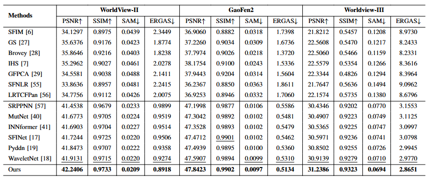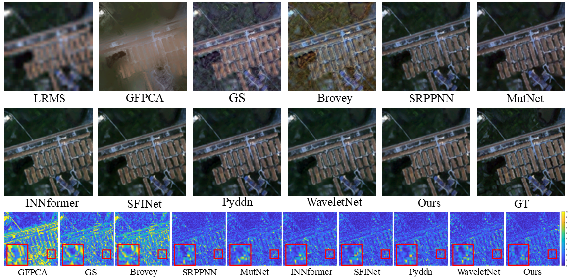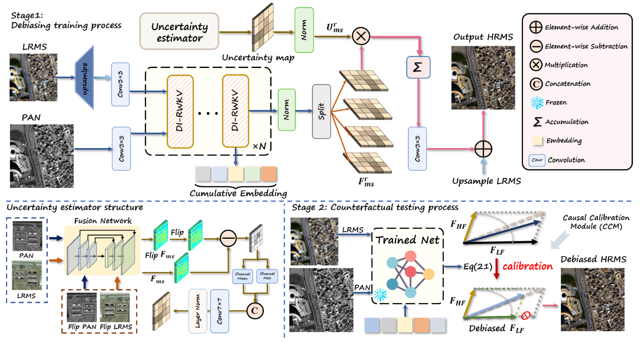 為解決上述問題,研究團隊引入了因果推斷方法。因果推斷是一種用于分析事物之間因果關系,并對因果效應進行量化分析的方法。研究團隊發現,多光譜遙感圖像中因雙分布現象引發的偏差會通過動量效應在模型優化過程中持續累積,影響特征學習的準確性。為此,團隊基于因果推斷理論,對遙感圖像融合過程進行因果分析與建模,通過量化并校準特征空間中由動量因素導致的分布偏差,進而構建了一種融合因果推斷與特征校準機制的全色銳化方法。該方法在訓練階段引入了具備全局感受野的Recurrent Weighted Key-Value(RWKV)架構,用于有效提取累積特征偏差;在測試階段,通過因果干預以及反事實推理技術,對于統計特征中的有偏因果效應進行了校準。同時,研究團隊在WorldView-II、GaoFen2和WorldView-III等多個公開數據集上進行了廣泛的實驗,表明了所提方法在峰值信噪比(PSNR)上展現了優越性能。