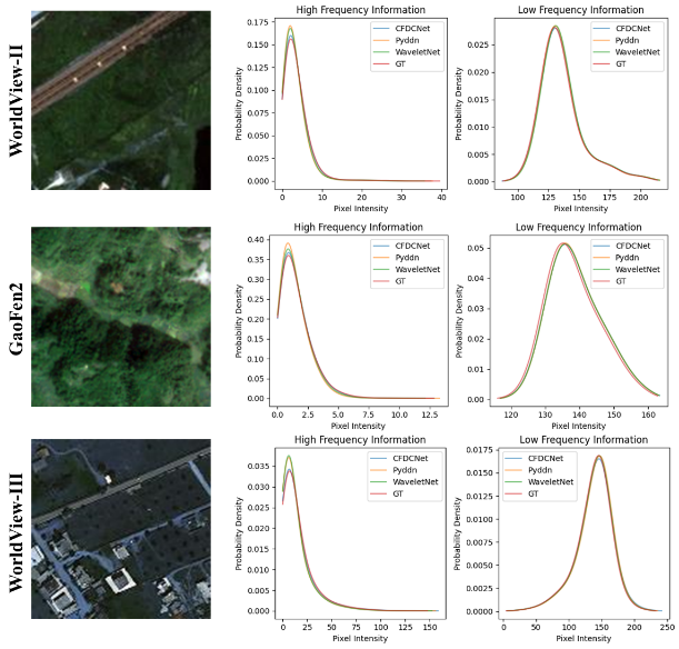 遙感圖像全色銳化是多光譜遙感圖像融合方向的核心技術,它通過融合低分辨率的多光譜圖像與高分辨率的全色圖像,生成視覺效果清晰,細節與紋理豐富的高分辨率多光譜遙感圖像。但多光譜遙感圖像中存在高低頻信息的長尾分布與高斯分布共存的雙分布現象。這種現象導致了現有的全色銳化網絡在優化時往往會對低頻信息過度擬合,并且由于長尾效應的影響無法對處于尾部的高頻信息進行有效的恢復。