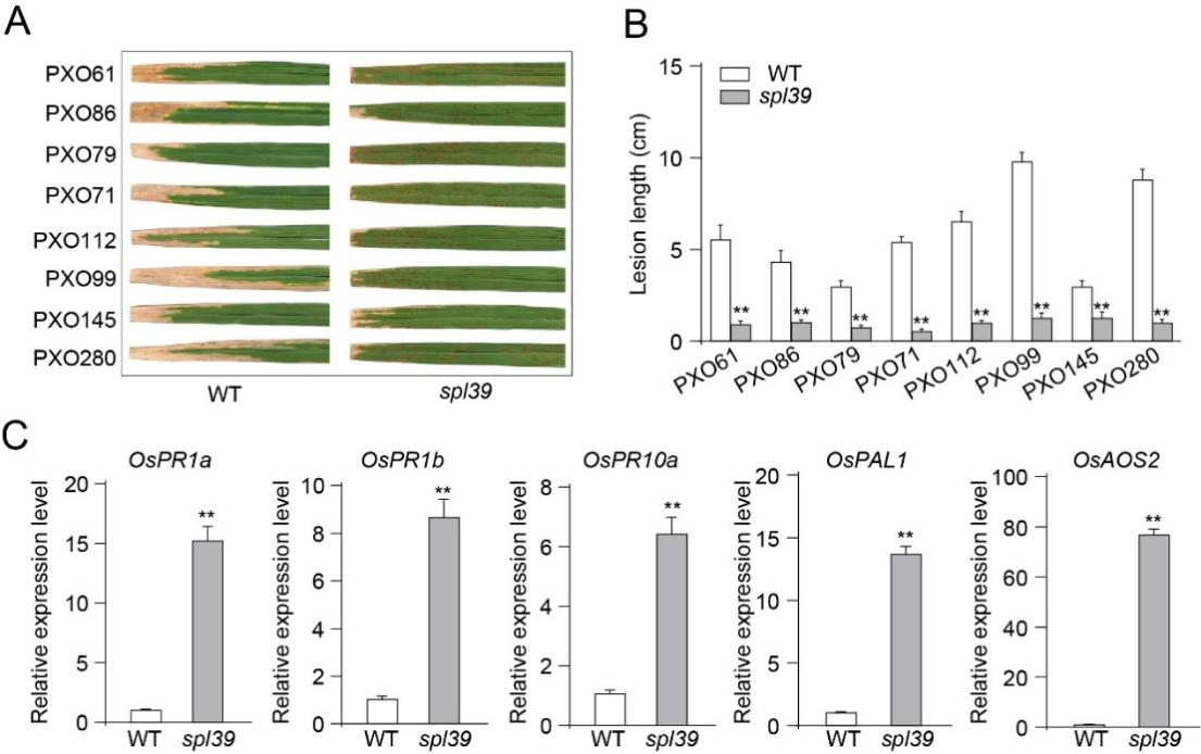 圖2 spl39突變體對水稻白葉枯病抗性增強且防御相關基因上調