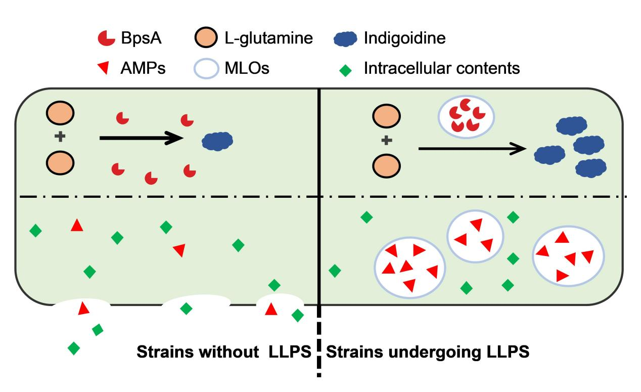 液液相分離驅動的無膜細胞器是一種新興的細胞結構工程技術,通過動態隔離酶和底物,有效提升代謝效率并增強目標產物的合成。該研究在谷氨酸棒桿菌中成功構建了功能性無膜細胞器,以新型生物藍色染料(indigoidine)為模型,將產量提升了2.43倍,驗證了這類合成凝聚體在代謝途徑優化中的應用潛力。此外,團隊通過對抗菌肽melittin和lactoferricin B進行空間隔離,有效降低了其對宿主細胞的毒性,實現了毒性生物物質的成功表達。本研究為解決工業微生物中“低產率”和“高毒性”兩大關鍵瓶頸提供了新的思路,也進一步拓展了LLPS技術在工業生物制造領域的應用邊界。