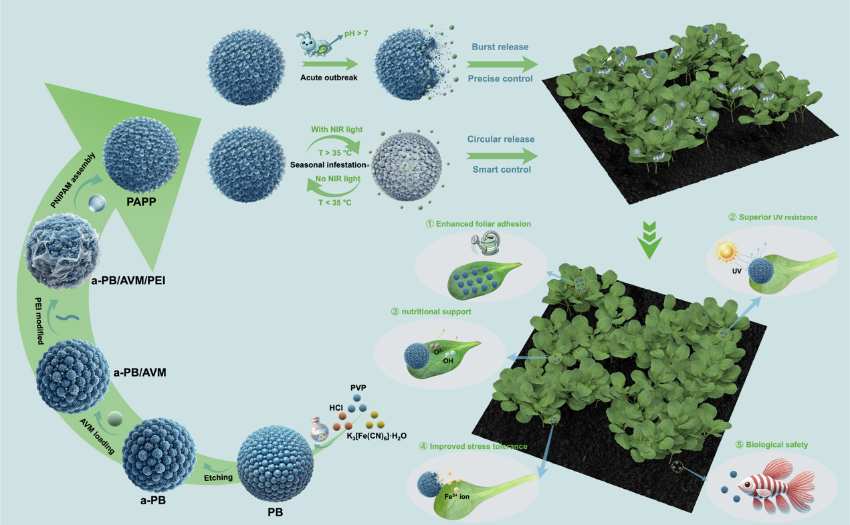 為此,研究團隊提出了基于普魯士藍(PB)納米粒子與聚N-異丙基丙烯酰胺(PNIPAM)納米水凝膠“門控”結合的設計,開發出三重響應納米農藥(PAPP)體系。該體系利用堿性條件實現阿維菌素(AVM)的速釋(24小時釋放率91.1%),應對突發蟲害;同時借助熱響應和近紅外光觸發實現緩釋,滿足季節性防控需求。實驗結果顯示,PAPP具有高藥物負載量和優異的抗紫外線性能以及顯著增強的葉面附著力,在小菜蛾防治中表現出高效殺蟲率(81.7%),體現了生態適應性與精準農業理念。該研究為農藥的智能輸送系統的構建提供了新方法,對推動農藥行業綠色轉型與可持續農業發展具有重要意義。