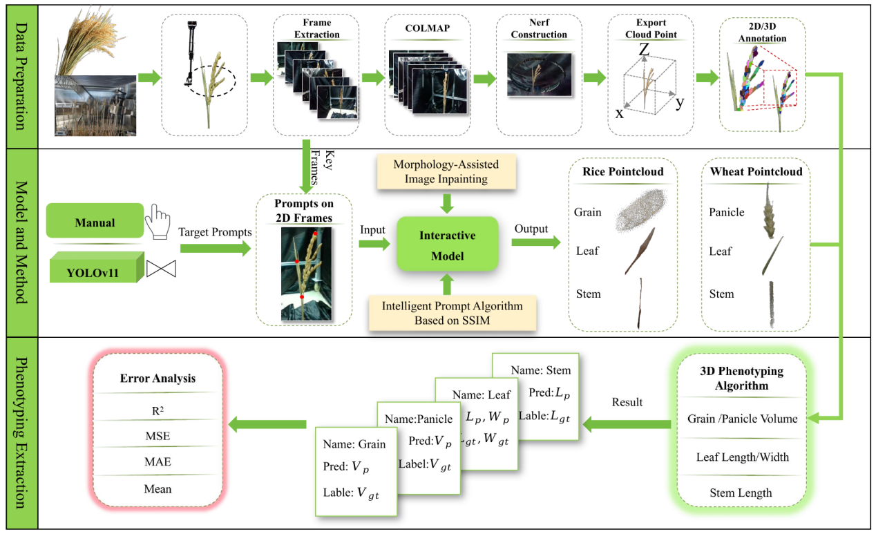 近期,中國科學院合肥物質院智能所黃河研究員團隊提出了一種基于神經輻射場(NeRF)與分割大模型(SAM2)融合的交互式無監督植物快速表型提取框架IPENS,實現了對水稻和小麥等作物多器官的高精度三維點云提取,顯著提升了植物表型分析的效率與準確性。該研究成果已正式發表于植物表型學領域知名期刊Plant Phenomics(中國科學院一區TOP期刊)。