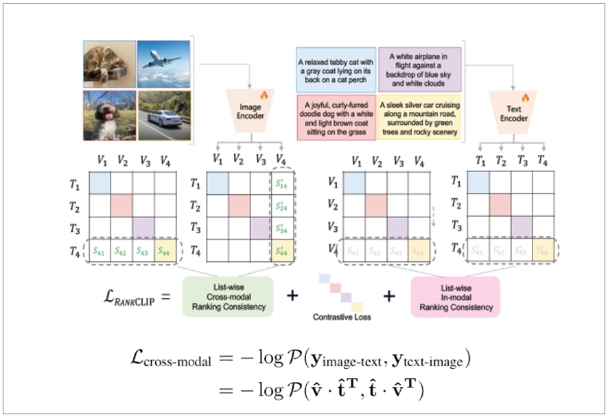 RankCLIP的核心突破在于:受人腦不同感官皮層和聯合皮層跨模態聯合表征機制啟發,將訓練目標從CLIP的“配對判斷”升級為“排序學習”,構建圖像與文本之間的全局排序分布,并通過最大化排序一致性似然來優化模型。該方法無需額外數據或計算資源,即可作為“即插即用”模塊融入現有CLIP系列模型,被大會程序委員會評價為“有望重新定義視覺-語言預訓練范式的突破性工作”。