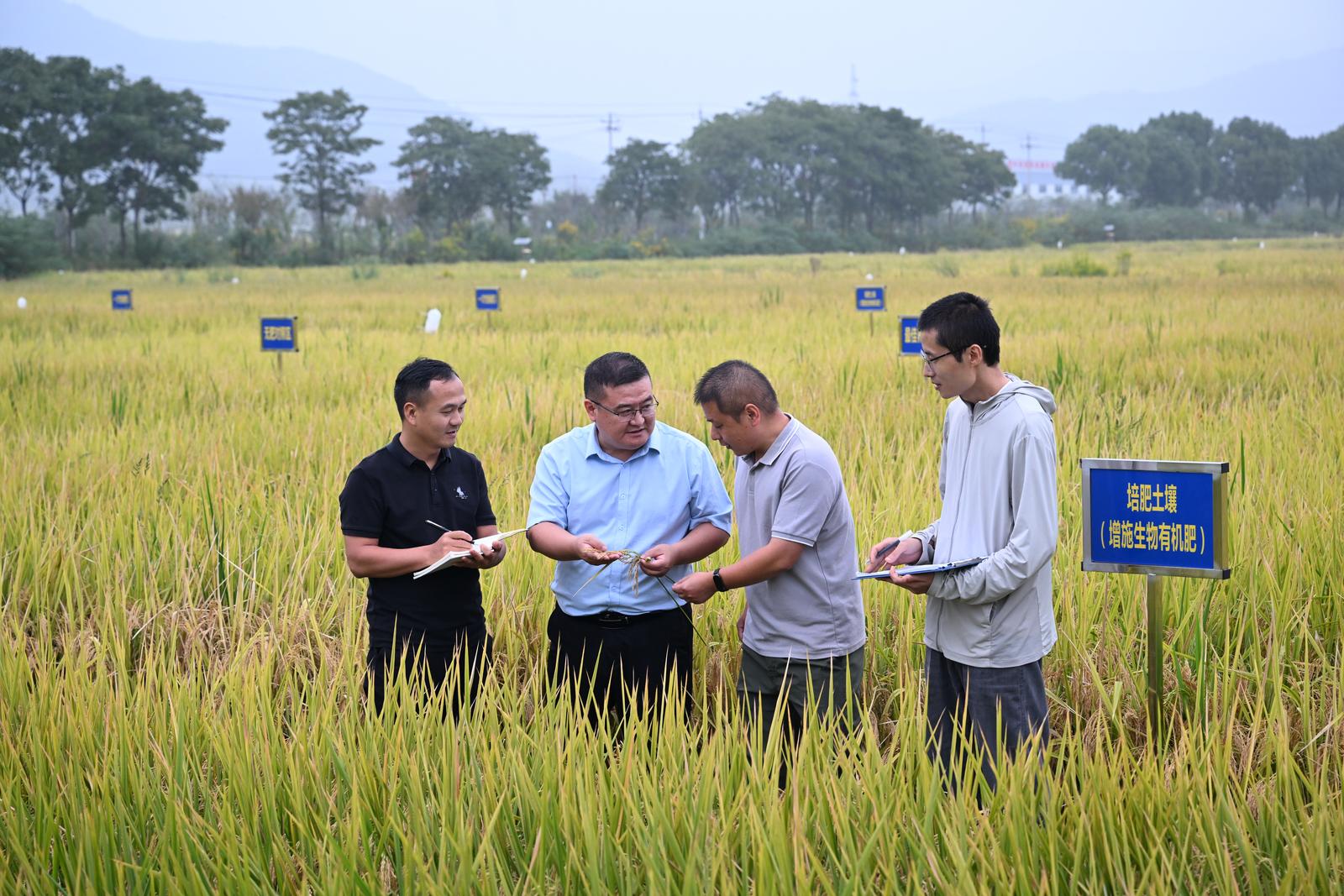 ?10月11日,在馬鞍山市和縣的稻-麥(油)綠色豐產增效技術集成示范基地,項目助理安徽農科院副研究員陳剛(左二)正與中國科學院合肥物質院智能所等單位的專家團隊調查水稻結實情況。